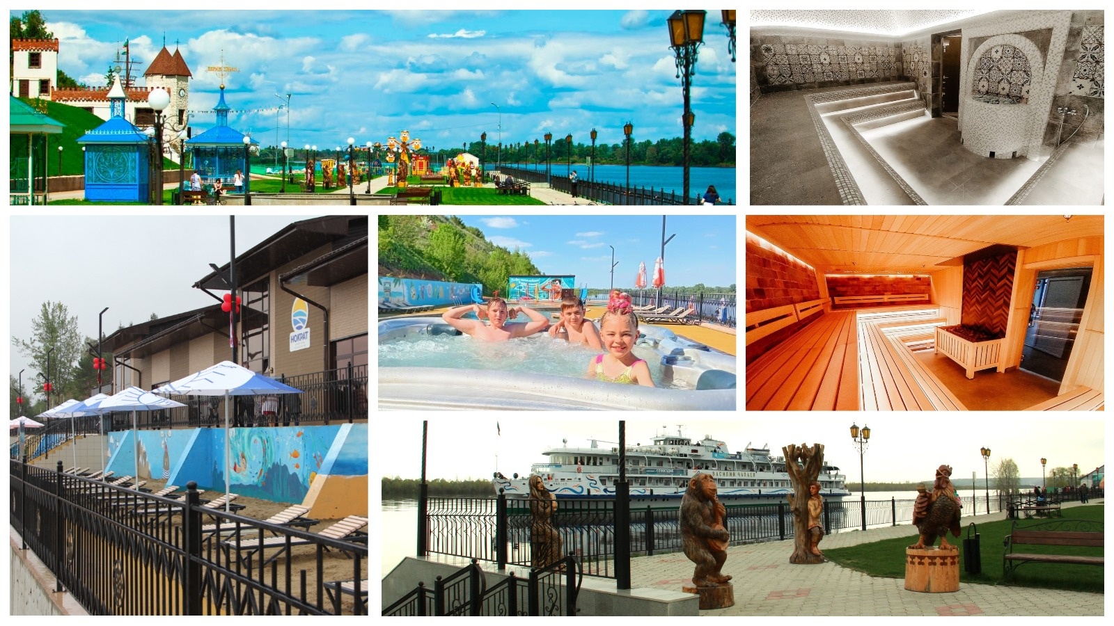 На первом уровне комплекса расположен классический песчаный пляж с видом на вятские волны и горизонт, утопающий в зелени сосен и берез, растущих на противоположном берегу .На втором -ряды удобных шезлонгов с яркими зонтиками, способными защитить отдыхающих от палящего солнца. На третьем уровне комплекса посетителей ждёт целый арсенал курортных развлечений. Здесь расположены два бассейна: отдельный искусственный водоём для взрослых и, стилизованный под мини-аквапарк, детский бассейн. Детишки с удовольствием ныряют в чистейшую воду, скатываясь со специальных горок.
