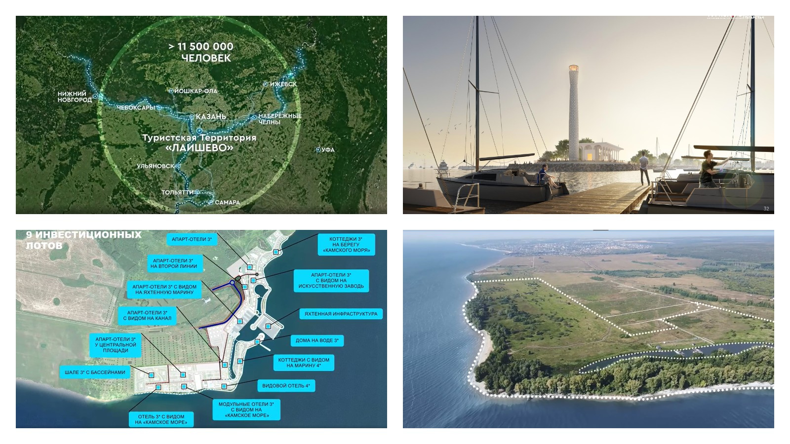 В одном из уникальных красивейших мест Татарстана, в точках слияния рек Волги и Кама на берегу крупнейшего в Евразии Куйбышевского водохранилища планируется создание всесезонного современного курорта Лаишево. Всего за 1 час из курорта можно доехать из Казани. В радиусе 300 км от Лаишево проживают более 11млн.человек потенциальной целевой аудитории. Прибрежное расположение территории и живописная естественная заводь вдохновили разработчиков проекта на создание самой современной яхтенной марины на Волге. В сердце курорта на 73 га территории гостям будут предложены разнообразные средства размещения от сервисных апартаментов и отелей различных категорий, до уединенных коттеджей, шале, домов на воде.