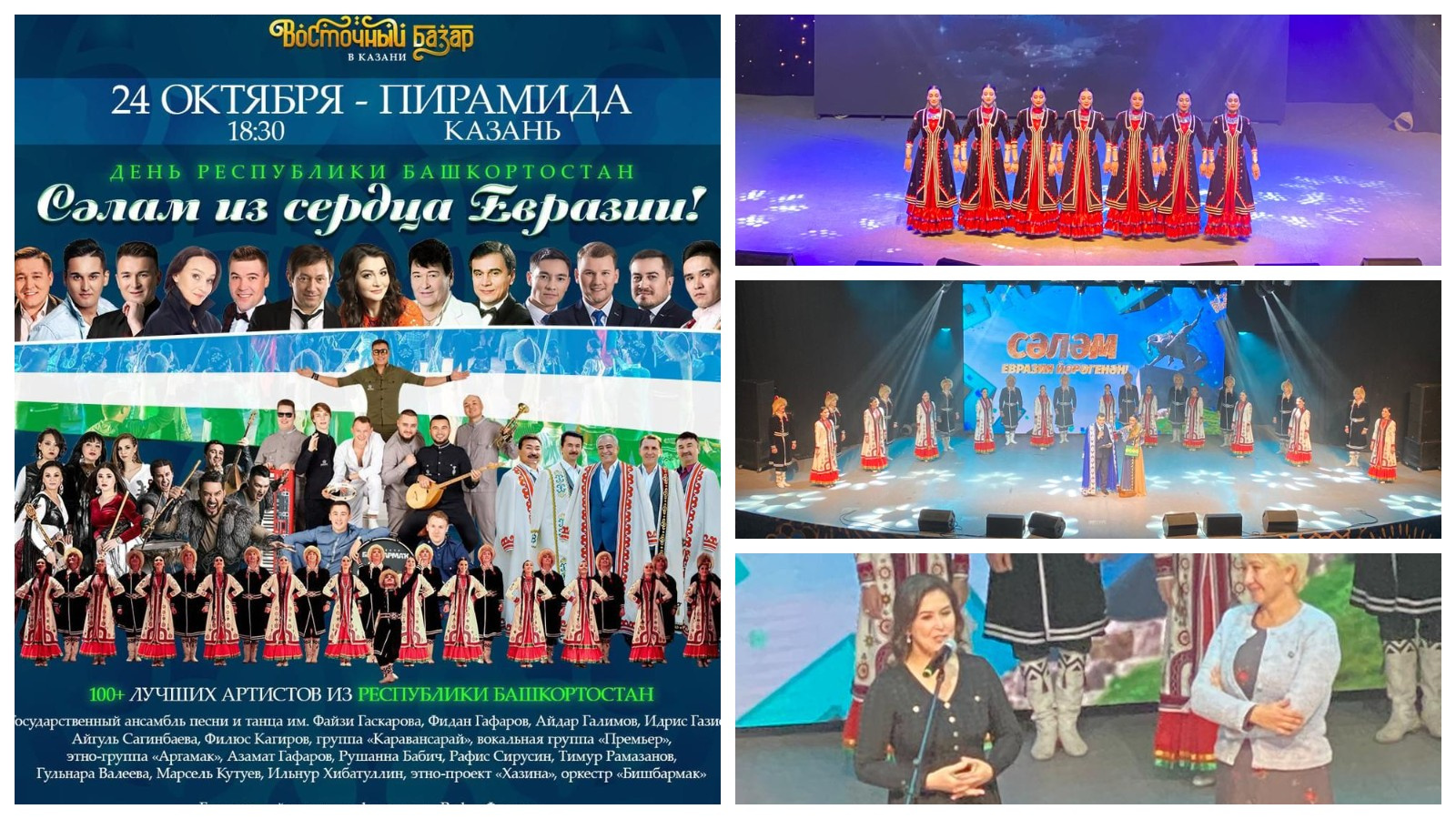 Впервые в рамках международного фестиваля национальных культур «Восточный базар в Казани» прошел День Республики Башкортостан. На концерте «Сәләм из сердца Евразии», организованном в КРК «Пирамида», во главе с министром культуры РБ Аминой Шафиковой приняли участие более 100 артистов и творческих коллективов.