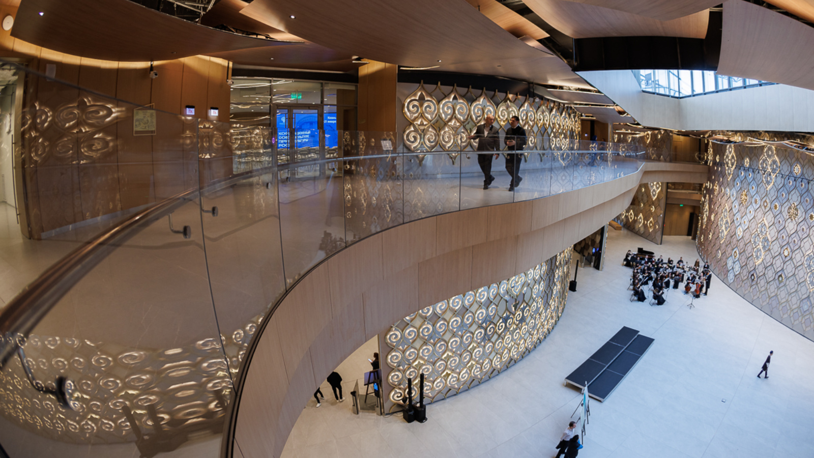 Гости заглянули в Восточный зал, оценили убранство и архитектуру фойе круглого зала, также осмотрели камерный зал на 60 мест и большой универсальный зал.З